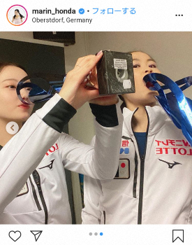「bavarianopen2020(ババリアン・オープン)」と題し、宮原とともにトロフィーをお面のように顔に当てたり、グラスに見立てたポーズを取ったりした写真をアップ。同大会で本田はショートプログラム(SP)、フリーとも2位で合計178・24点の2位。宮原はSP、フリーとも1位で、合計192・02点で連覇した。
