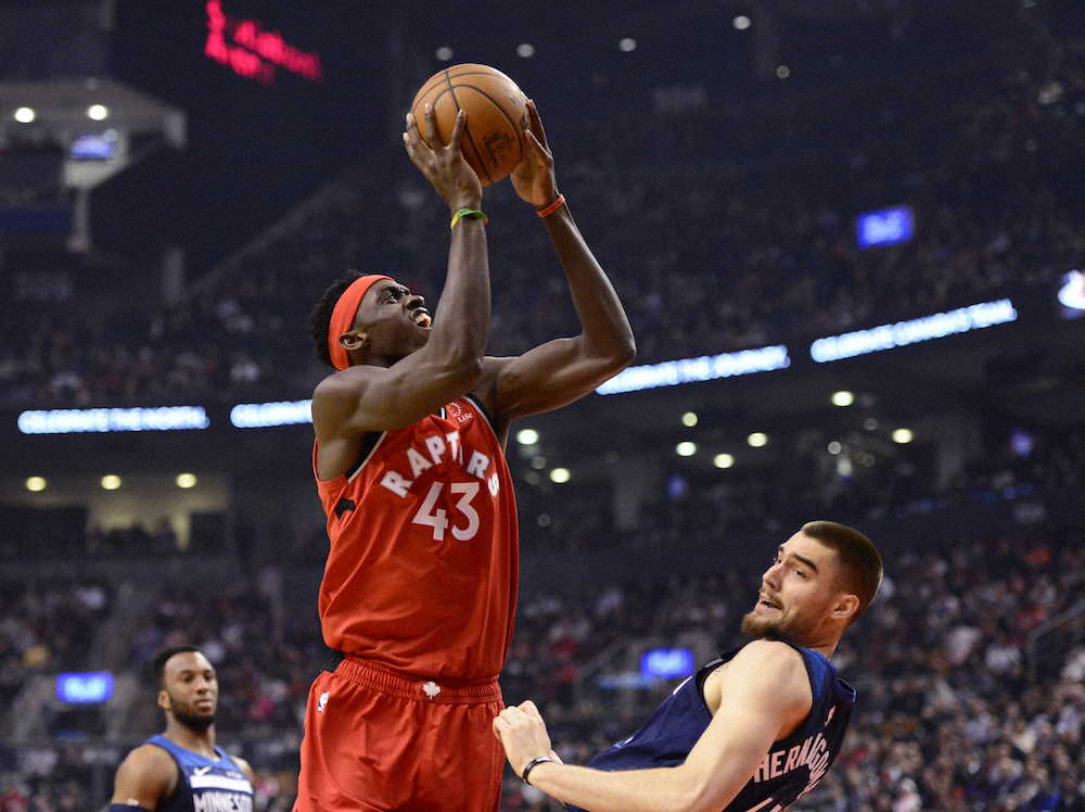 NBAは10日に各地で9試合を行い、昨季のファイナルを制した東地区全体2位のラプターズは地元トロントでティンバーウルブスを137―126(前半74―75)で下して40勝14敗。パスカル・シアカム(25)が34得点、カイル・ラウリー(33)が27得点と11アシストをマークするなど、球宴出場コンビが活躍してチーム新記録となっている連勝記録を「15」に更新した。