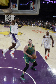 NBAは23日に各地で7試合を行い、西地区全体首位のレイカーズは、24日に故コービー・ブライアント氏の一般葬儀が営まれるロサンゼルスのステイプルズセンターで東地区全体3位のセルティクスに114―112(前半56―54)で競り勝って43勝12敗。29得点、8リバウンド、9アシストを稼いだレブロン・ジェームズ(35)が109―110で迎えた残り30・4秒、右サイドからフェードアウトしながらのジャンプシュートを成功させてチームを5連勝に導いた。
