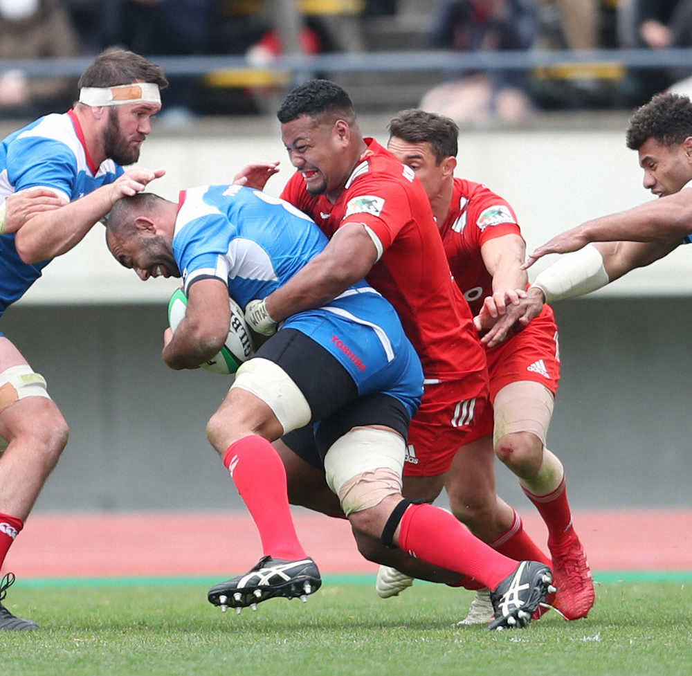 後半、東芝のリーチ(左)の突進を阻止する神戸製鋼のタウムア・ナエアタ(右はダン・カーター)(撮影・坂田 高浩)
