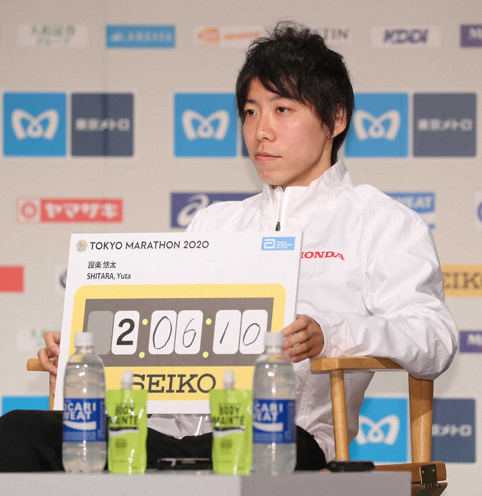 どこまで本気なのか。設楽はつかみどころがなかった。東京五輪代表の条件、2時間5分49秒への自信を聞かれると○、△、×の札の中から、3強で1人だけ△を出した。目標タイムは「2時間6分10秒」と自己記録の1秒更新にとどめた。