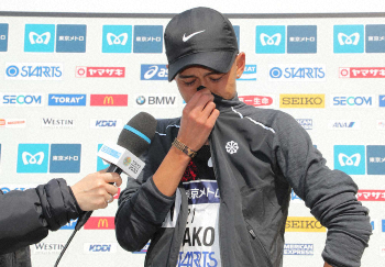 23キロで先頭集団からいったん遅れた。一時はアジア王者の井上に10秒以上の差をつけられ「駄目かなと思った」と弱気になりかけた。しかし、32キロすぎで井上に追い付き、ライバルのつらそうな顔が目に入ると「チャレンジしてみようかな」と一気に加速して抜いた。「ケニアでの練習でも1人で耐えることを学んできた。残り10キロはいける手応えはあった」。30キロから35キロの5キロは優勝したレゲセを11秒上回る14分56秒。勝負どころで再び14分台を刻み、2年前の自分を21秒上回った。ゴール直前ではガッツポーズを繰り返して雄叫びを上げ「最高の直線でした」と相好を崩した。
