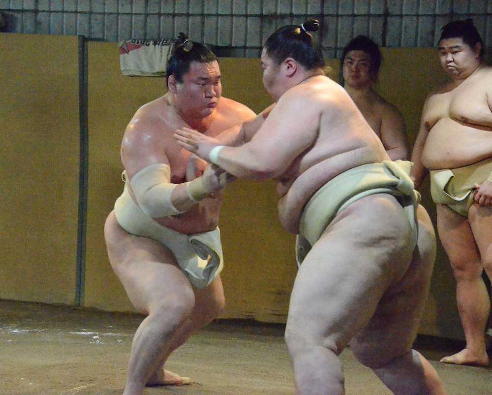 1月の初場所を「腰部挫傷、右踵部(しょうぶ)裂傷蜂窩(ほうか)織炎」で途中休場してからは初めての出稽古。「感覚、感触ですね」と話した通り、右四つに組み止める相撲を中心に確認した。逸ノ城に胸を合わせられて一気に寄り切られた以外は、鋭い踏み込みからの厳しい攻めで圧倒した。