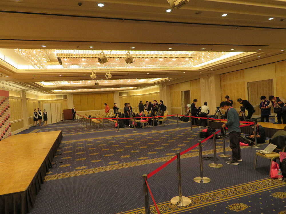 記者会見場では選手と記者の接触を避けるため、ひな壇の前のスペースを5メートルほど開けてV字型に席をセッティング。さらに席と席の間は1人分の間隔が取られ、会場は昨年より2倍の広さになった。会場内には空気清浄器7台と消毒液3本が設置。記者にもマスクの着用が義務づけられ、質疑応答の際に使用する報道陣のマイクは、1回質問をするごとに消毒するなどが徹底された。