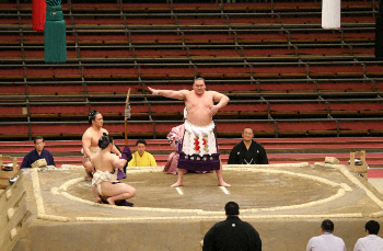 館内に入ると、土俵の周りに見えるのは審判の親方に呼び出しの姿だけ。幕内の取組からは呼び出しが懸賞幕を掲げ、土俵をぐるりと一周した。