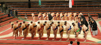 力士はガランとした館内で、まるで稽古場のような雰囲気の中で取組を行った。