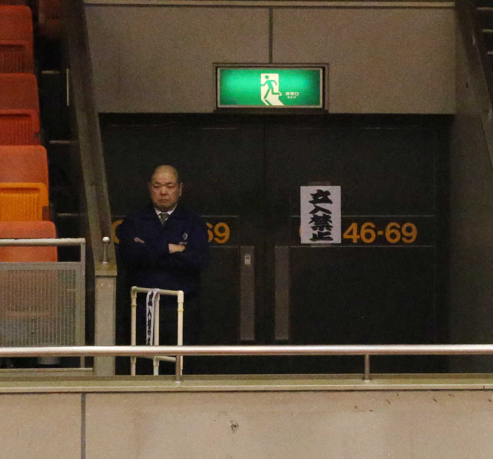 八角理事長(元横綱・北勝海)は、普段の場所は館内の役員室でテレビ観戦するが、この日は観客席に出て中入り後の相撲を見守った。