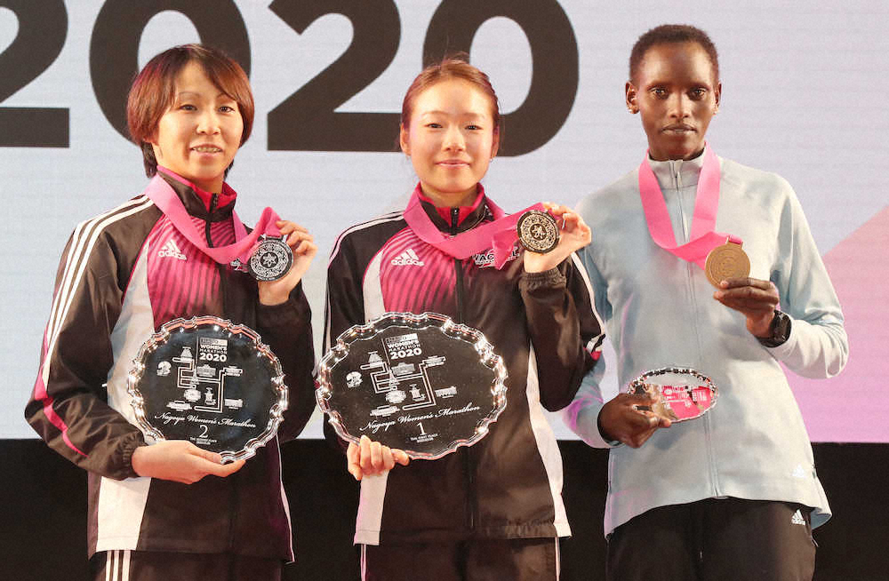 <名古屋ウィメンズマラソン>表彰式でメダルを手にポーズを決める(左から)安藤友香、一山麻緒、ピュアリティー・リオノリボ(撮影・椎名 航)