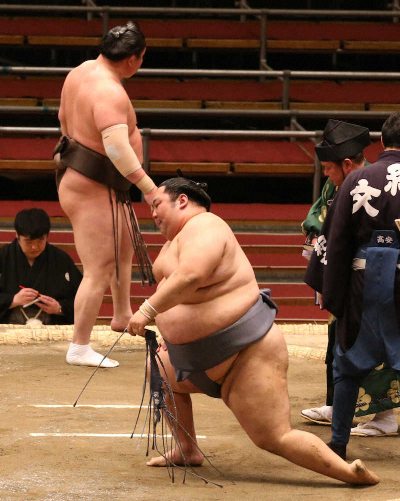 38年ぶりの1人大関・貴景勝は、御嶽海に寄り切りで敗れ3敗目。御嶽海は5連勝。大関獲りに挑む関脇・朝乃山は、左大腿(だいたい)二頭筋などの損傷でこの日休場を発表した高安に不戦勝。全勝をキープした。