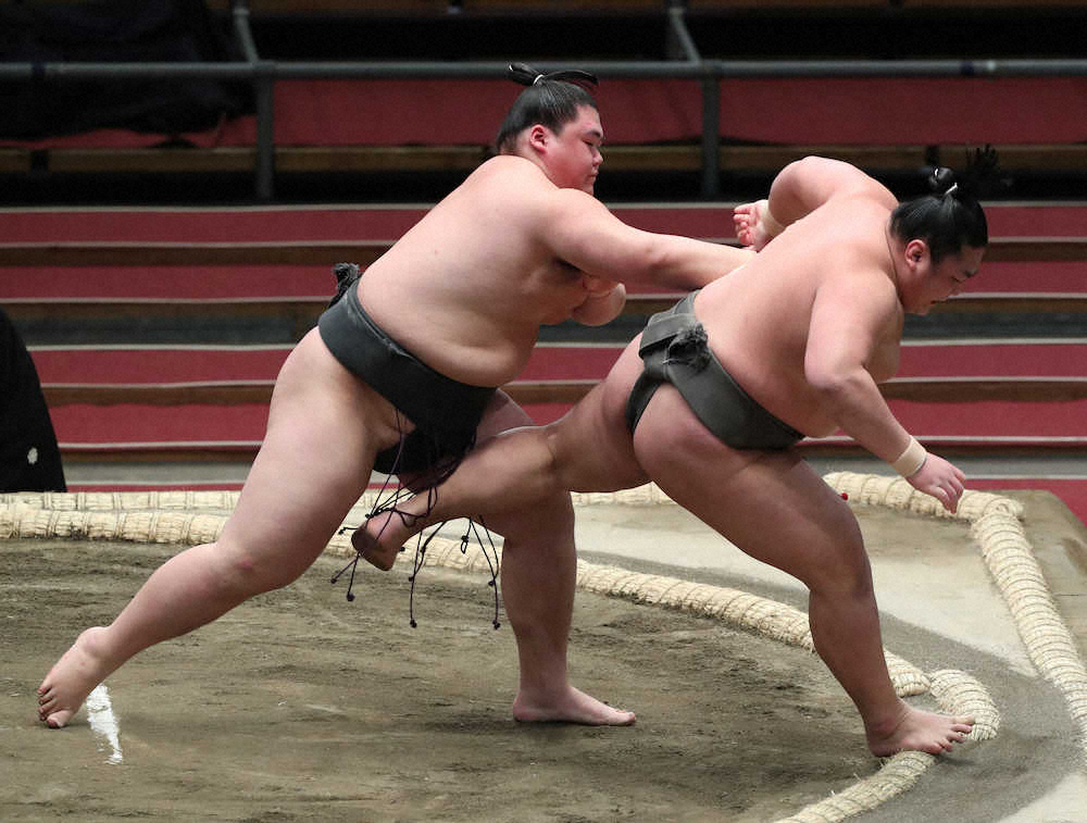 大鵬の孫、幕下の納谷が王輝を押し倒しで破り、勝ち越しに王手をかけた。立ち合いから伸びのある突きを見舞って、そのまま押し切った。