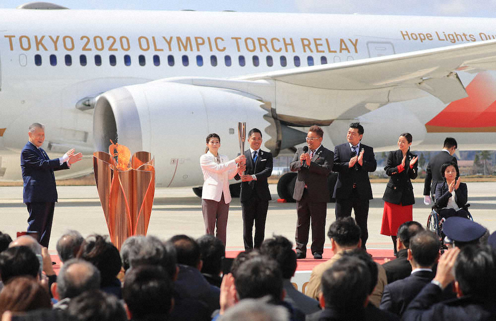 ギリシャで採火された東京五輪の聖火が20日、特別輸送機で宮城県東松島市の航空自衛隊松島基地に到着した。1998年の長野五輪以来22年ぶり。だが、この日、東日本を襲った暴風の影響で「聖火到着式」などのイベントのあらゆる予定が変更されるドタバタの連続。出席者の相次ぐ“遅刻”、青空に描かれるはずだった5色の五輪マークも霧散。新型コロナウイルスの感染拡大で険しい道を進む東京五輪を象徴するスタートとなった。