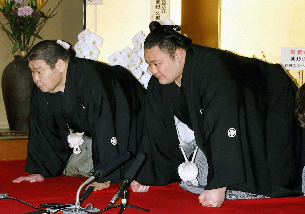 日本相撲協会は25日、エディオンアリーナ大阪で大相撲夏場所(5月10日初日、両国国技館)の番付編成会議と臨時理事会を開き、関脇・朝乃山(26=高砂部屋)の大関昇進を満場一致で決めた。大阪市内で行われた昇進伝達式で朝乃山は母校・富山商の校歌にある「愛」「正義」、師匠の高砂親方(元大関・朝潮)と同じ「一生懸命」の四字熟語を口上に盛り込み、最高位の横綱を目指す決意を示した。