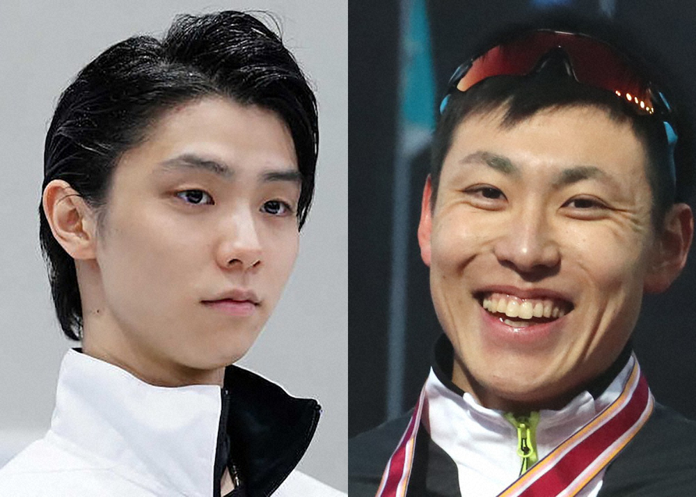 2019~20年シーズンの最優秀選手に選ばれたフィギュアスケートの羽生結弦(左)、スピードスケートの新浜立也