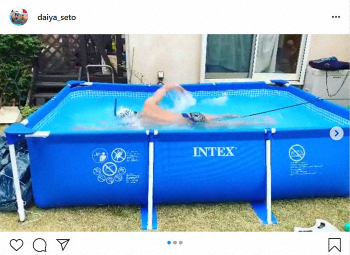 瀬戸は画像と動画をアップ。自家用プールを組み立て、そこで泳ぐ自身の姿をカメラに収めていた。