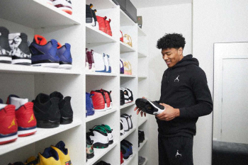 約3カ月前に実際にBoConceptの店舗に足を運び、インテリアデザイナーにイメージを伝えてレイアウトを依頼。ダークカラーで統一された空間に仕上がった。身長2メートル3の体がゆったりと収まるソファやバスケットシューズが列ぶシュークローゼットは必見。「僕が欲しかった空間がそのまま来たなと思いました。すごく気に入ってますし、素直に見てカッコイイと思いました。車でも、物でも、服でも、シンプルなもので揃えたいといつも思っていて、そんな空間にいると落ち着きまし、ゆっくり過ごせます」と語っている。