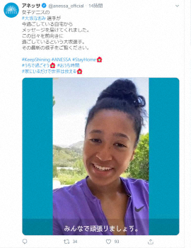 女子テニスの大坂なおみ(22=日清食品)が13日、資生堂アネッサの公式SNS上で自撮り動画を公開し「医療従事者の方々、そして最前線で働く皆さんに心から感謝します」とメッセージを発信した。自宅でのトレーニングも紹介し「この外出自粛期間中、私はあまりテニスができておらず、姉と絵を描いたり、料理スキルを磨こうと頑張ったりしています」と近況を報告。「皆さんが元気で、願わくば、なにか新しいことを学べていたらいいなと思います。この困難を共に乗り越えましょう。みんな元気で、ハッピーでいてね。みんなで頑張りましょう!」と呼びかけた。