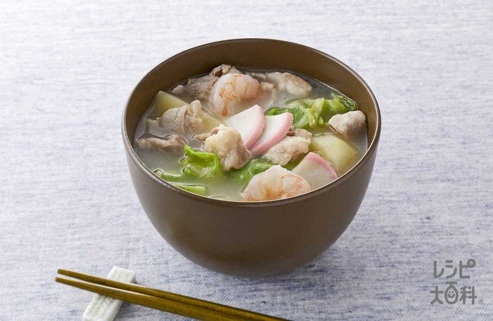 【レシピ】(1)皮を除いた鶏もも肉(80グラム)をひと口大、ジャガイモ(1個半)を薄い輪切りに切る。白菜(4枚)はざく切りにする。