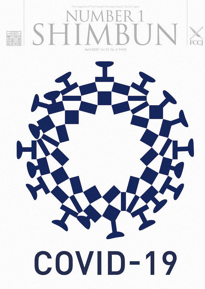 日本外国特派員協会の月刊誌に掲載された、東京五輪の大会エンブレムと新型コロナウイルスのイメージを掛け合わせたデザイン(同協会のホームページから)