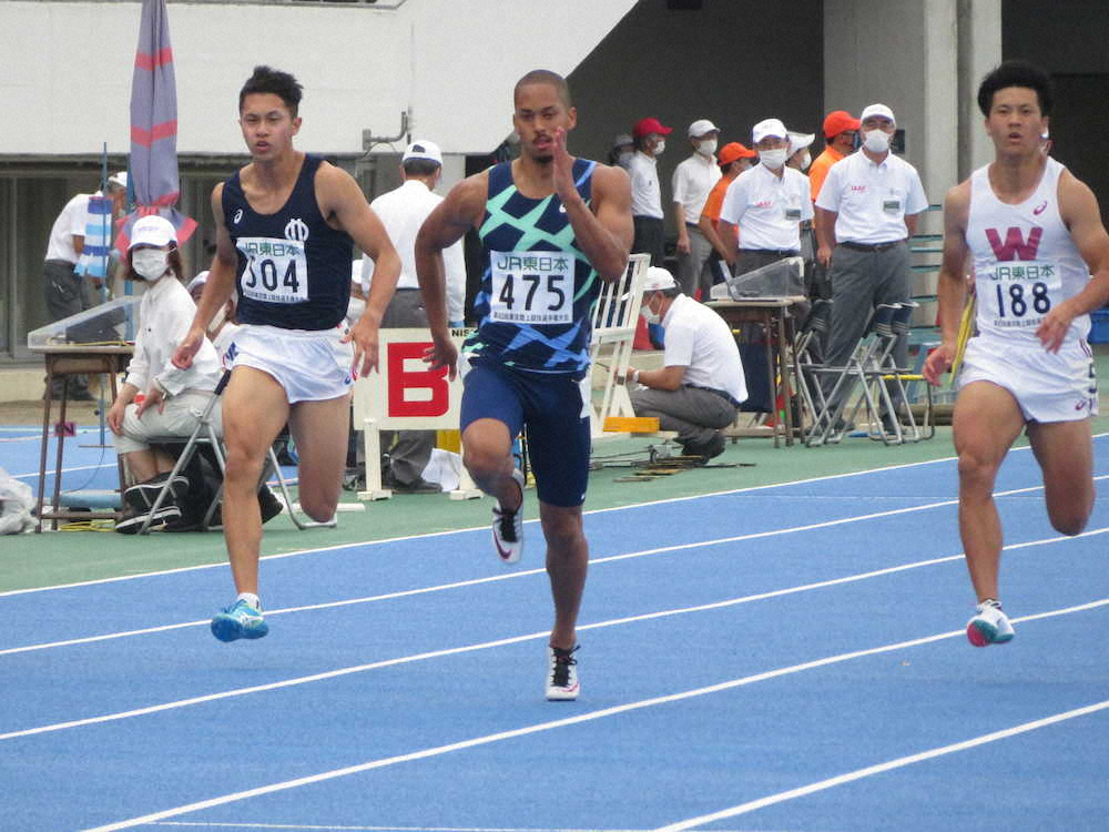 男子100メートル決勝で大会新記録をマークして優勝したケンブリッジ飛鳥(中央)