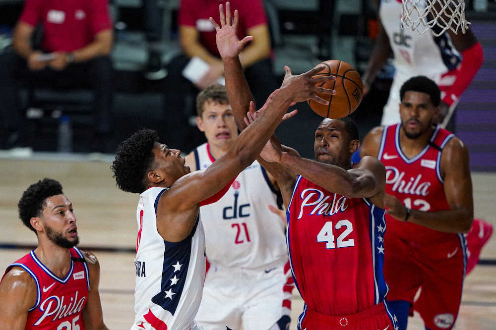 76ers戦の第3Q3分すぎ。左サイドでイサック・ボンガ(20)からボールをもらった八村塁(22)は、208センチのポイントガードで2017年シーズンに新人王となったベン・シモンズ(24)との1対1に挑んだ。シモンズを背にして少し押し込んだあと、ペイント内を右方向に移動。リングから遠ざかる形で右手でボールをリリースしたが、フックシュートになり切れない“未完成”の一投はリングに嫌われた。