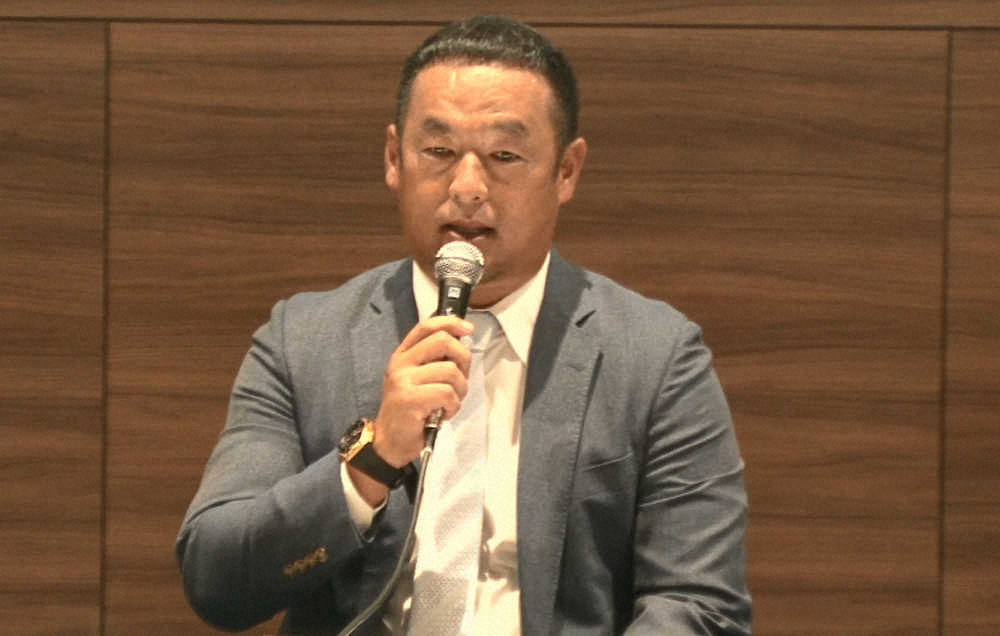 日本ハンドボールリーグ機構のアンバサダーに就任しあいさつする松中氏(C)JAPAN HANDBALL LEAGUE