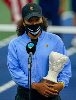 入場時には「エリジャ・マクレーン」と記された黒いマスクを着用。昨年8月にコロラド州で警察官による取り調べ後に死亡した黒人男性の名前だった。「彼の名前を表現することができ、特別な日になった。人種差別は米国に限ったことではなく世界中の問題。人々に気づいてほしい」。今大会は黒人被害者の名前の入った7種類のマスクを用意。決勝まで進み全て披露することを目標に掲げている。