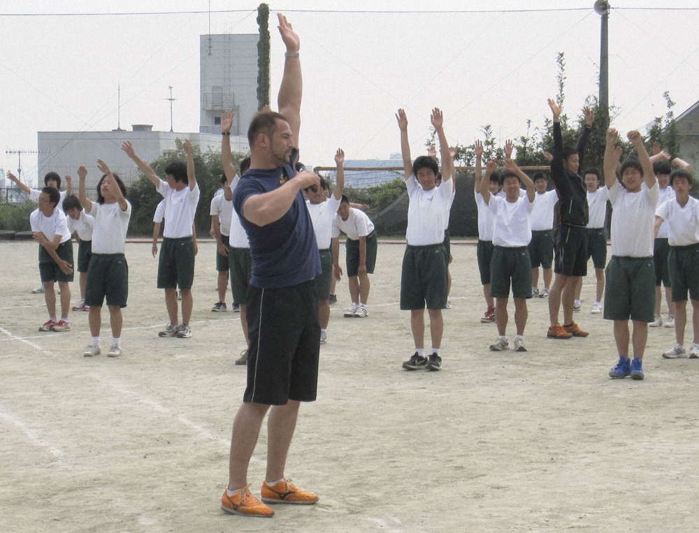 11年6月、宮城県石巻市の門脇中で生徒と一緒にストレッチ