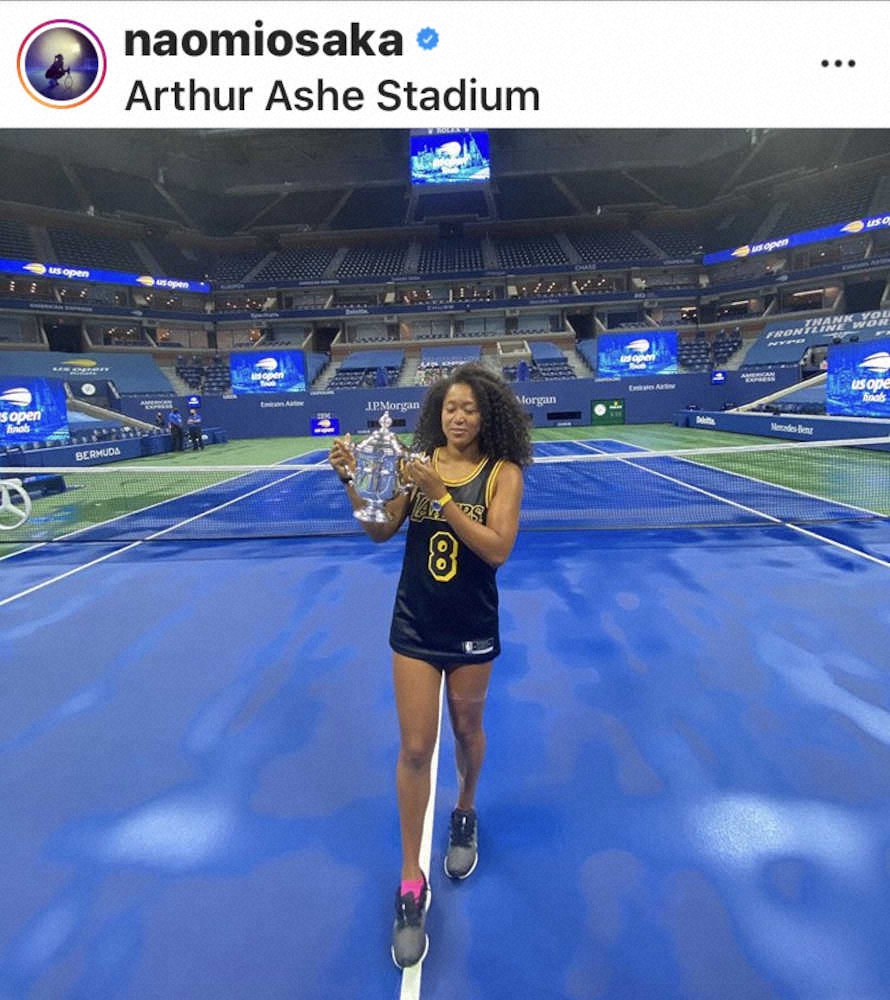 優勝後の公式会見に大坂はレーカーズの背番号8のユニホームで臨んだ。そのまま、誰もいないコートで優勝カップを持った写真を撮影し、自身のSNSに掲載。「試合後にはいつもこのジャージーを着ていた。私に力を与えてくれたと思う。いつも」とつづった。
