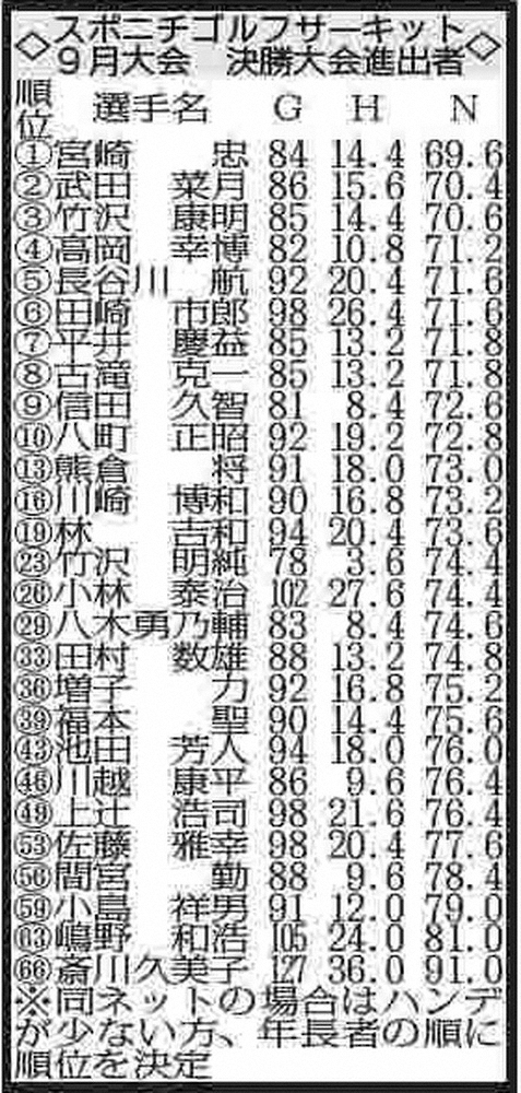 関東の名門ゴルフ場をラウンドする「スポニチゴルフサーキット」の9月大会が16日、栃木県の日光カンツリー倶楽部で66人が参加して行われた。宮崎忠さんがグロス84、ハンデ14・4、ネット69・6で優勝。女性1位にはグロス86、ハンデ15・6、ネット70・4で武田菜月さんが輝いた。