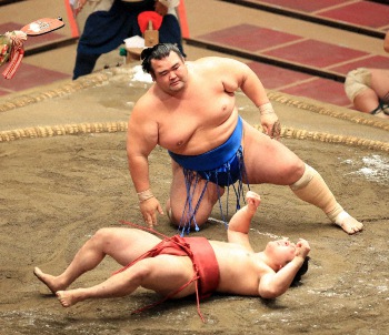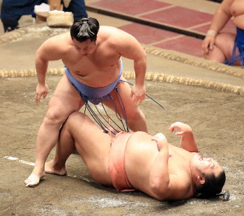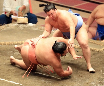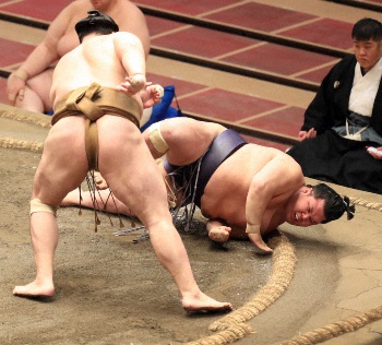 炎鵬(左)を腰砕けで破る琴奨菊(撮影・久冨木 修)