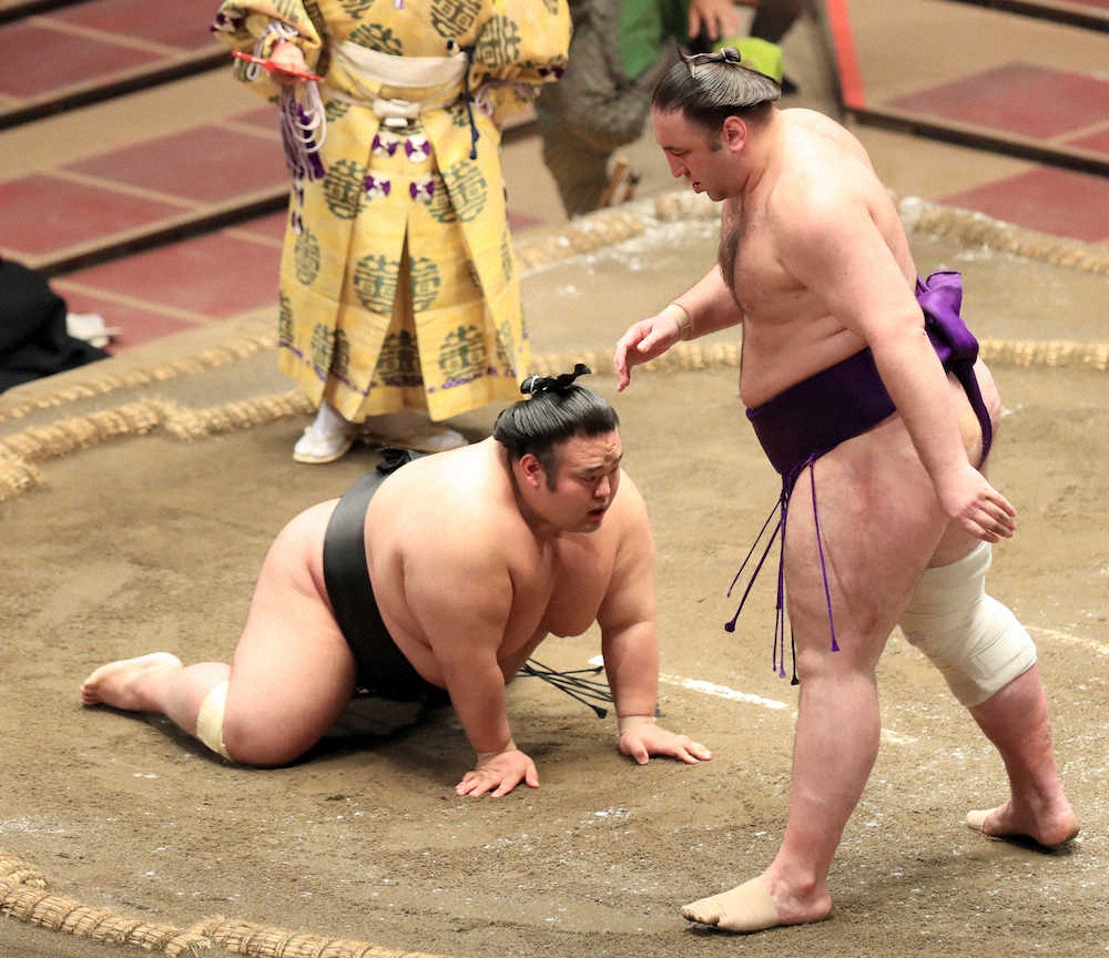 大関・朝乃山は豊山が右足首負傷で休場したため不戦勝。初日から3連敗後5連勝となり、トップの2敗勢と1差になった。