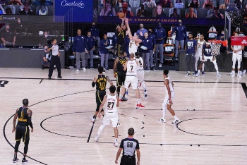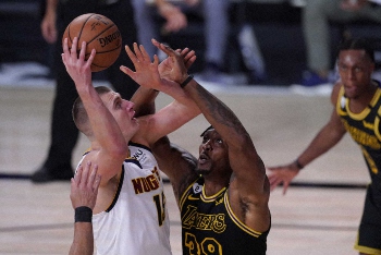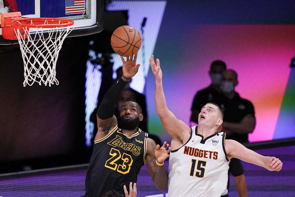 ナゲッツのヨキッチとリバウンドを争うレイカーズのジェームズ(AP)