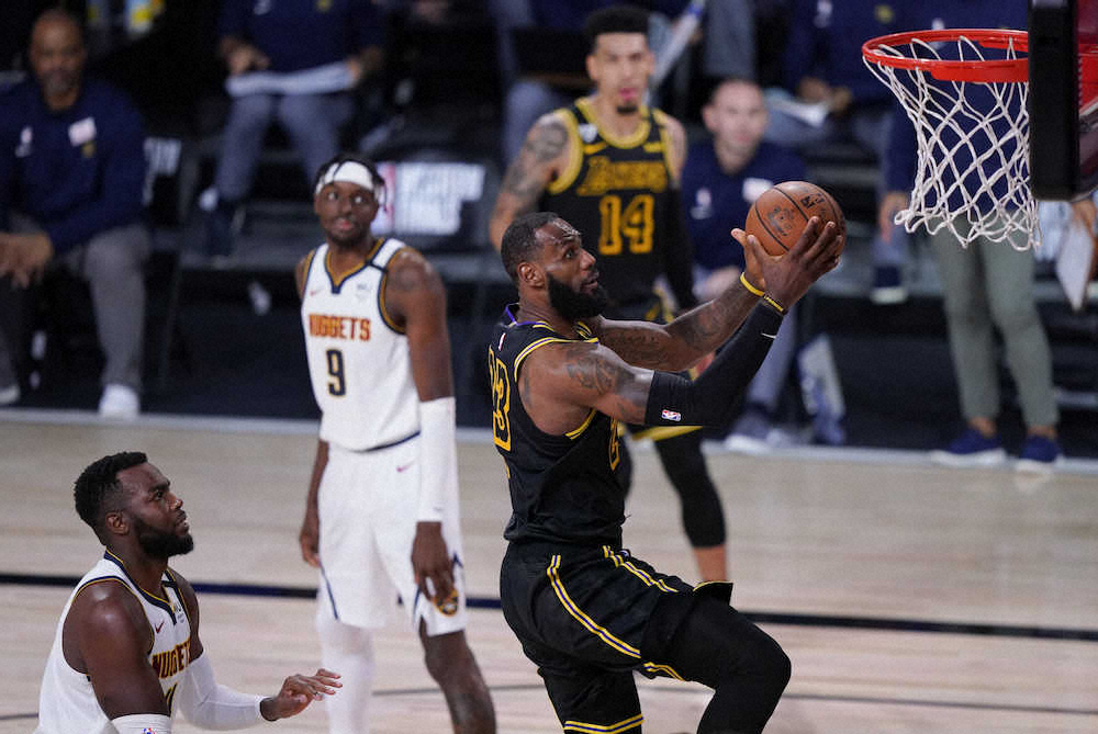 レイアップに持ち込むレイカーズのジェームズ(AP)