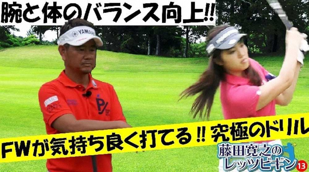 今回はフェアウェーウッド(FW)を正確に打つためのコツを紹介します。ミス日本ミススポーツの田中絵梨果さんのミスショットの原因を「脇が開くことにあり!」と指摘した藤田プロ。それを防ぐためには、もう一度スイングドリルをチェックするべきだと言います。脇を締めることで、腕と体が一体となり、FWのミート率が高まるというわけです。進行役をティーチングプロのジミー常住氏が務めます。
