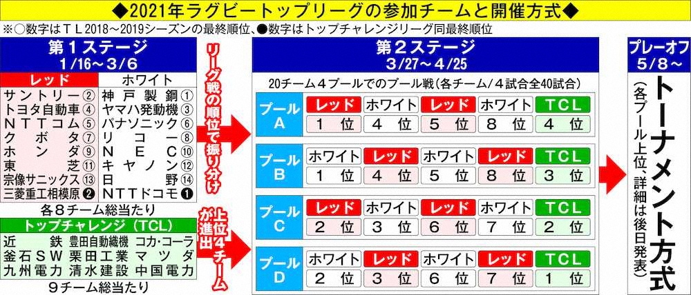 新型コロナ対策にも着手する。全選手のPCR検査を義務づけ、陽性者が発生した場合の対応策、第3波、4波と発生した場合の変更フォーマットも今後詳細を詰める。3密となりやすいダブルヘッダー(同一会場2試合開催)もなし。「何とかここまで来た。W杯で盛り上がった状況を22年につなげることが重要」と太田氏。再び楕円(だえん)球で列島を熱くするため、ラグビー界が“挙党一致”となる。