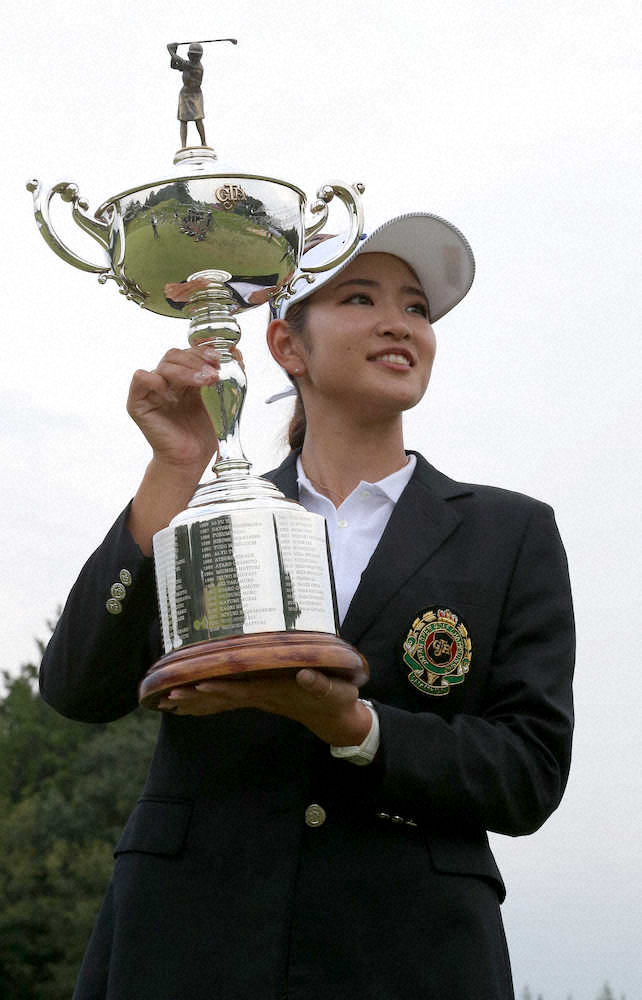 <第53回日本女子オープンゴルフ選手権・4日目>優勝杯を手に笑顔の原英莉花(代表撮影)