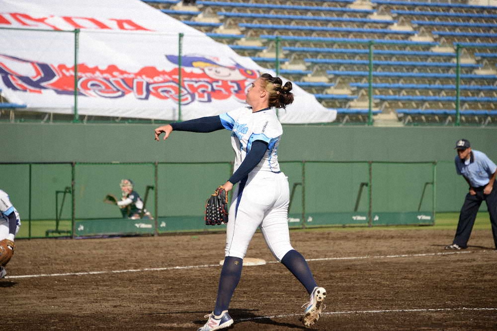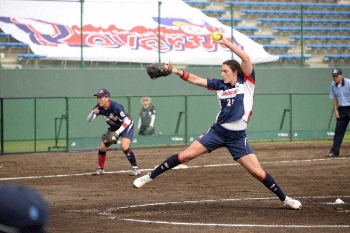 <戸田中央総合病院・Honda>8回に痛恨の2ランを浴びた戸田中央総合病院先発・テーラー(日本ソフトボール協会提供)