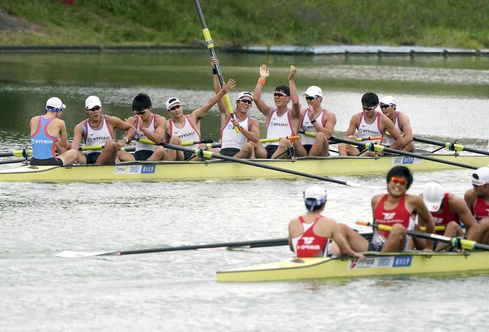 男子エイトで優勝し、喜ぶNTT東日本(左)