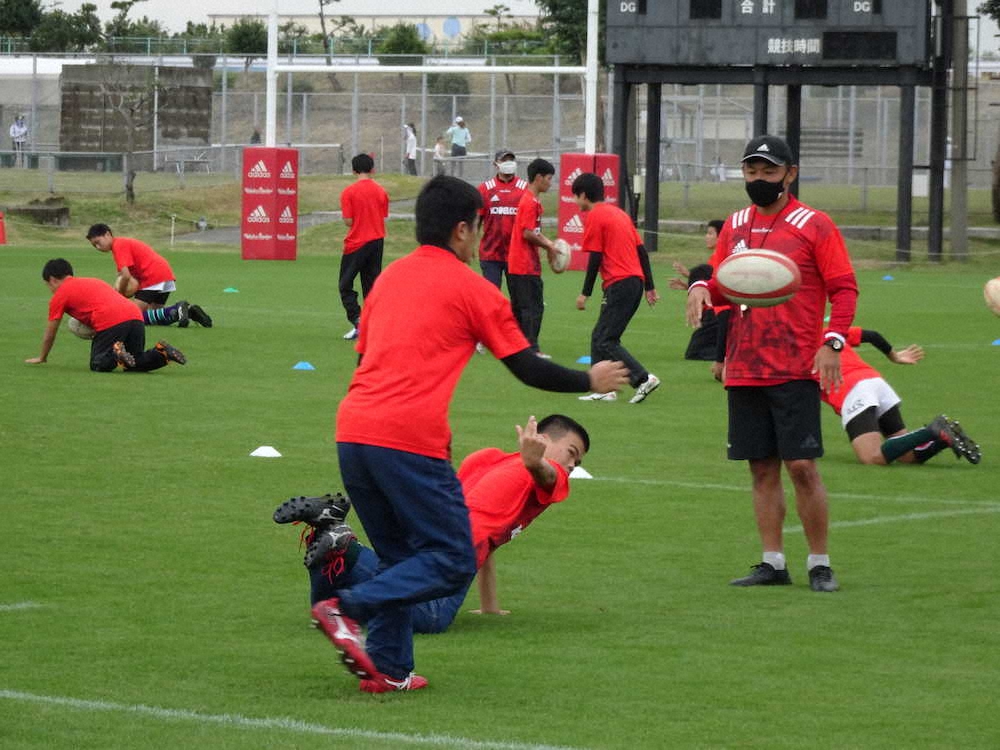 約80人が参加。チームからはデーブ・ディロンヘッドコーチ、水間良武フッカー&育成コーチ、森田恭平アシスタントコーチ、SO/CTB李承信らが参加した。バックフリップパス、背面パス、オフロードパスなど、高度なテクニックのレッスンもあり、選手からは笑顔がこぼれた。最後はタッチフットで締めくくった。
