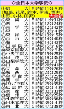 駒大が大会新記録となる5時間11分8秒で、最多優勝記録を更新する13度目の優勝を6年ぶりに飾った。2区でシード圏外の9位まで落ちたが、アンカー田沢廉(2年)へ3位でつなぐと、最後は東海大とのデッドヒートを制し、正月の箱根駅伝優勝に弾みを付けた。2連覇を狙った東海大が2位。3位には明大、2年ぶりの優勝を目指した青学大は4位。新型コロナウイルス感染拡大の影響で10月の出雲全日本大学選抜駅伝が中止になり、今大会が「大学3大駅伝」の初戦だった。