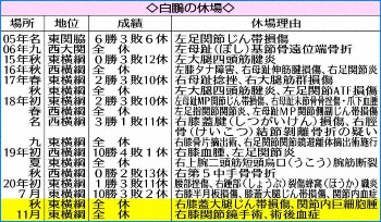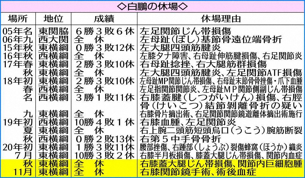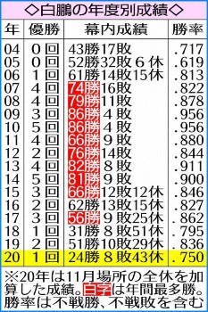 白鵬の年度別成績 Photo by スポニチ 鶴竜に続き3場所連続で白鵬も欠場…史上初2場所連続両横綱初日から不在、来… ギャラリーで見る この記事のフォト 2020年11月07日の画像一覧 もっと見る 2020年11月07日の画像をもっと見る