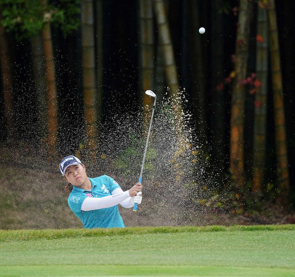 17番、バンカーからの第3打を放つ畑岡(撮影・沢田 明徳)