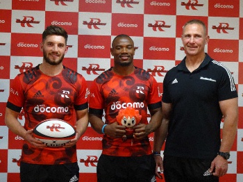 NTTドコモに加入した(左から)SOオーウェン・ウィリアムス、WTBマカゾレ・マピンピ、ヨハン・アッカーマン監督