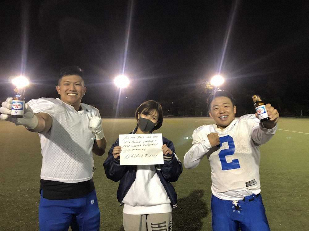リーチが贈ったメッセージとリポビタンDを手に喜ぶ東京学芸大アメリカンフットボール部の部員