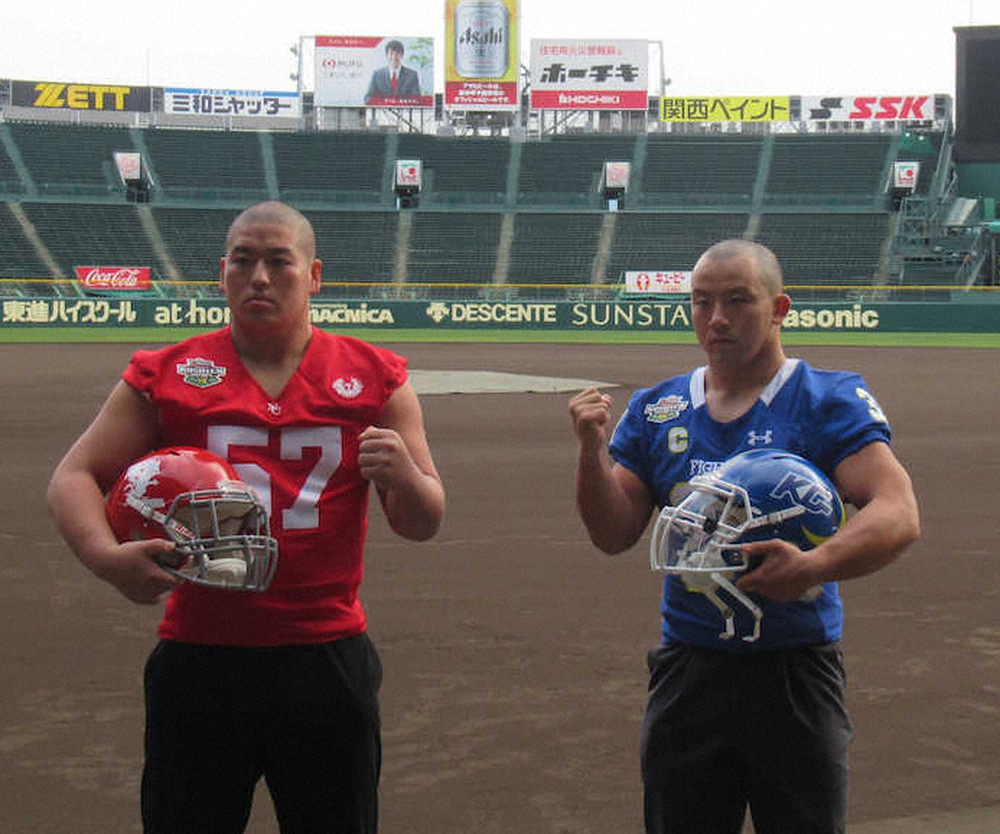 アメリカンフットボールの学生日本一を決めるスポーツニッポン新聞社後援「第75回甲子園ボウル」(13日キックオフ)の記者発表会見が30日、甲子園球場で行われ、日大(関東代表)と関学大(関西代表)の監督、主将が出席。反則タックル問題が起きた18年5月の定期戦以来の対戦に気持ちを高めた。それぞれのチームカラーである「赤と青の対決」は伝統の一戦で今回が30度目の激突。芝の養生が間に合わず、フィールドの約40%が黒土で開催されるため、両校とも対応を迫られる。
