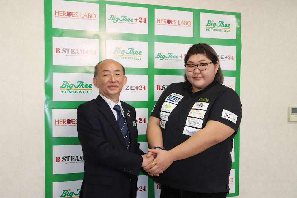 朝比奈沙羅(右)は所属先のビッグツリースポーツクラブ・里村佳行社長と握手(撮影・中出健太郎)