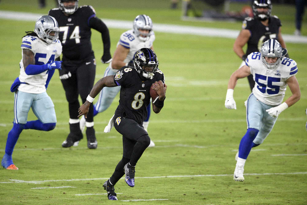 NFLは8日、ボルティモア(メリーランド州)で第13週最後の1試合を行い、地元のレイブンズが34―17(前半17―10)でカウボーイズを下して7勝5敗。新型コロナウイルスへの感染が判明して前週のスティーラーズ戦(2日)を欠場したQBラマー・ジャクソン(23)がパスで2つ(38ヤード&20ヤード)、ランで1つ(37ヤード)のTDをマークしてチームの連敗を3でくい止めた。
