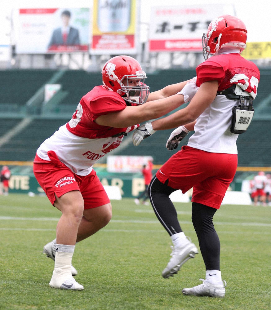 隠して勝つ! 13日キックオフの甲子園ボウルに出場する日大が12日、決戦の地で練習を公開した。関東1部上位「TOP8」の優勝決定戦、桜美林大戦(11月29日)で右肩を痛めて負傷退場したQB林大希(4年)は取材に応じたものの、出場可否についてはノーコメント。18年5月の「反則タックル騒動」以来の再戦となる関学大に対し、神経戦を仕掛けた。