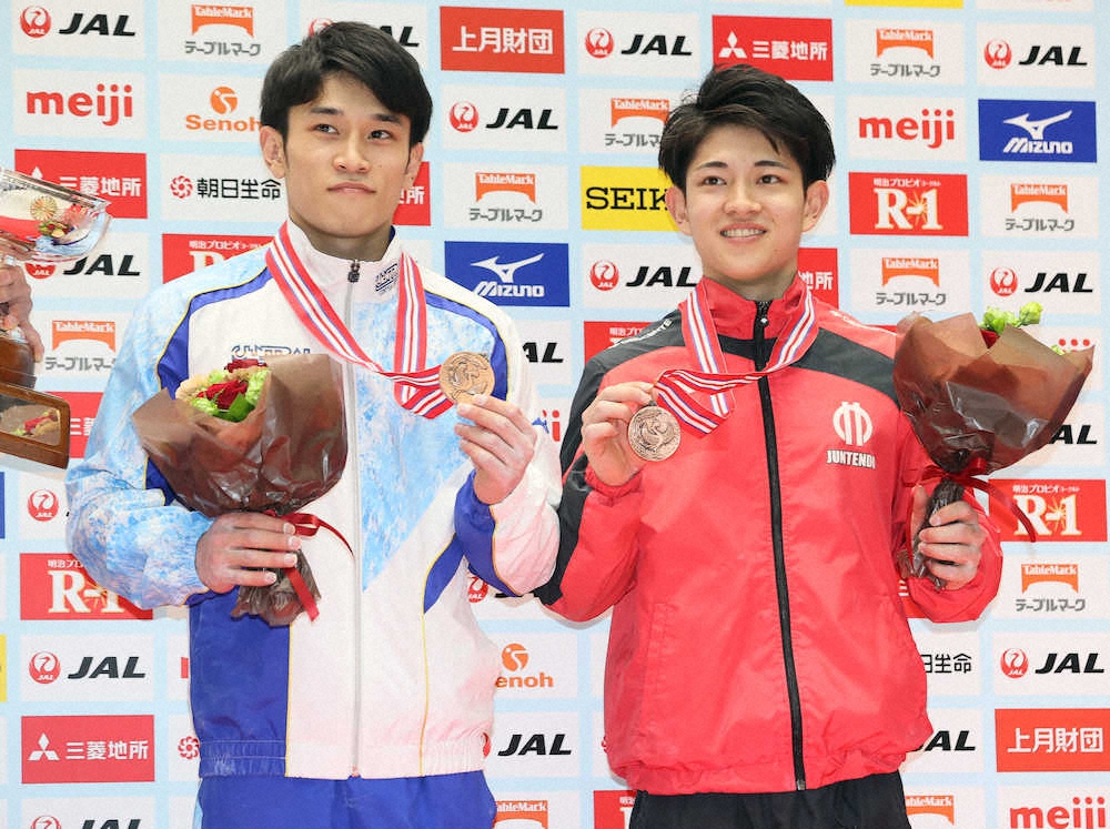 兄弟そろって男子個人総合で3位に入った谷川航(左)と弟の翔