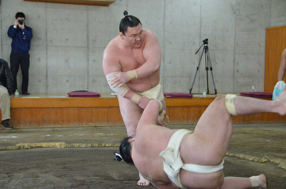 合同稽古は10月に続いての参加。前回は新大関の正代らと相撲を取ったが「自分の中では全く駄目だった」というように、右膝を再び痛める結果となった。右膝の状態は「前回に比べたらだいぶいい」と手応えを口にした。初場所(来年1月10日初日、両国国技館)で初の綱獲りに挑む大関・貴景勝(24=常盤山部屋)にはぶつかり稽古で胸を出し、3分間にわたって何度も転がした。